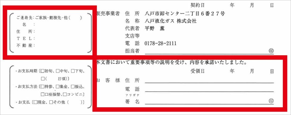 A. 弊社から、「液化石油ガス法・特定商取引法に基づく書面及び確認受領書」と記載された書面を郵送させていただきます。そちらに赤枠の箇所(住所・電話番号・変更後の契約名義・緊急連絡先)をご記入の上、同封された返信用封筒に入れてポストへ投函をお願いいたします。また、Webによる名義変更は行っておりませんので、ご了承ください。