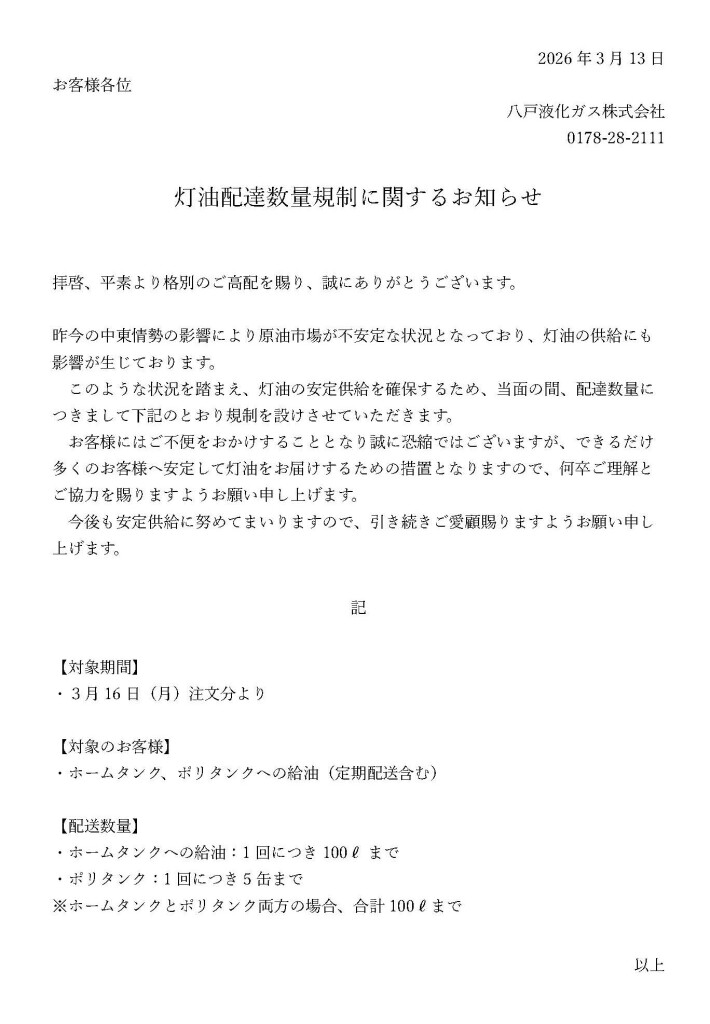 灯油配達数量規制に関するお知らせ